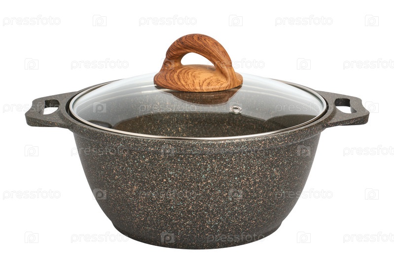 Профессиональный новый пустой контейнер для приготовления пищи с гранитной антипригарной поверхностью и стеклянной крышкой, изолированный на белом фоне