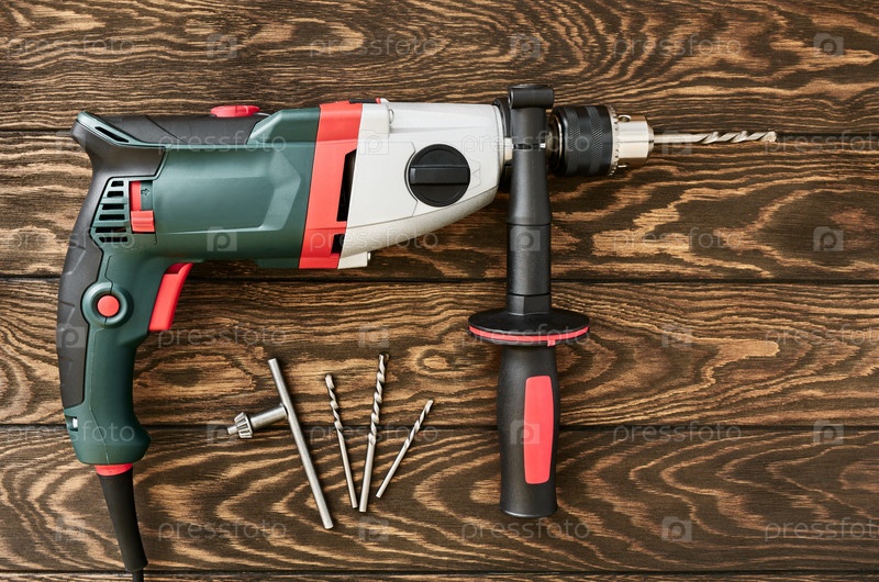 Профессиональный электрический перфоратор с ручкой на деревянном фоне