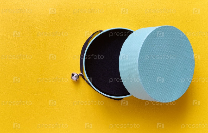 Круглая открытая синяя подарочная коробка на желтом фоне с местом для текста