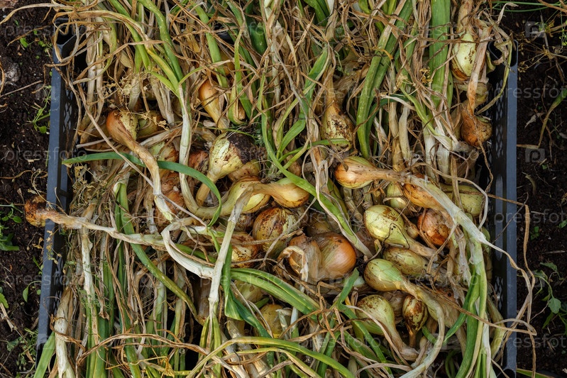 Лук с зелеными листьями выложен для сушки в черную пластиковую коробку. Сбор лука. Вид сверху