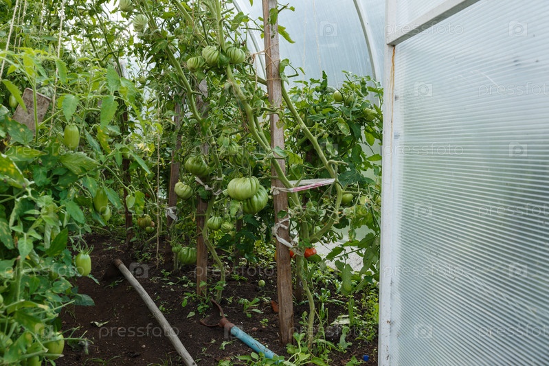 Теплица для томатов. теплицы из поликарбоната в саду. Открытая дверь в оранжерею