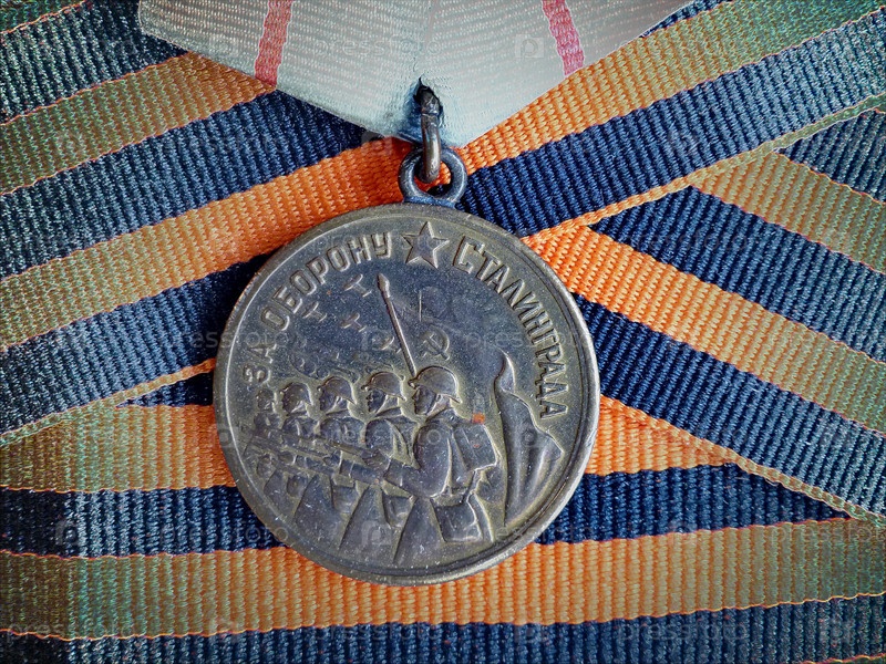 Медаль "За оборону Сталинграда" на георгиевской ленточке. Крупный план. Награды фронтовика. 9 мая - День Победы