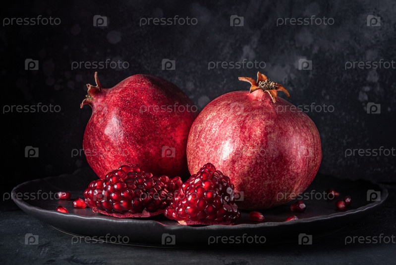 Два граната и кусочки очищенного граната на темном фоне, сдержанный, горизонтальный