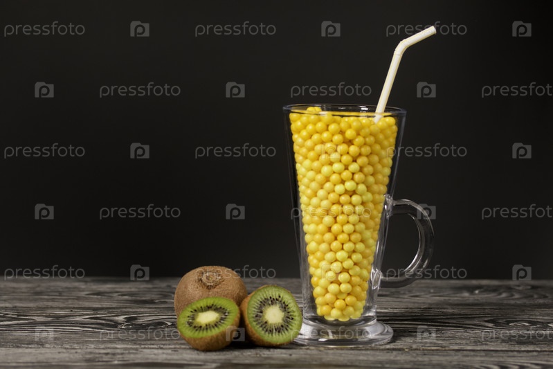 Стеклянный бокал наполнен витаминами в форме драже. Половинки киви рядом. На черных сосновых досках. На черном фоне
