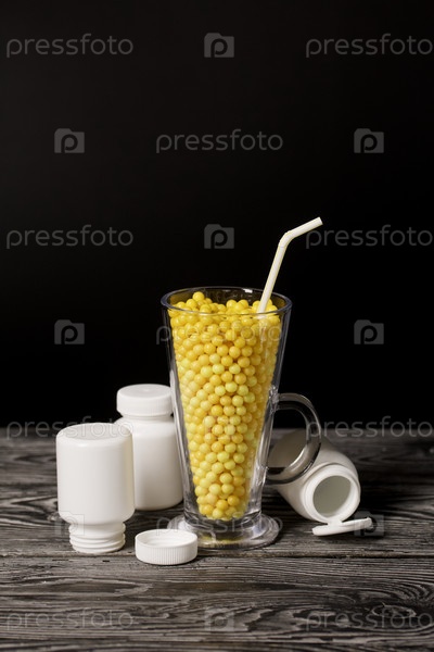 Стеклянный бокал наполнен витаминами в форме драже. Возле открытых пухлых баночек. На черных сосновых досках. На черном фоне