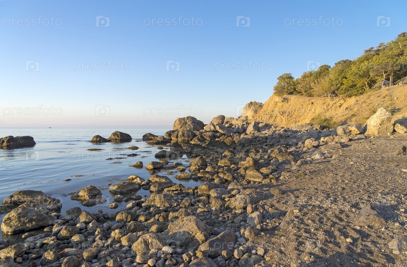 Тихое солнечное утро на берегу Черного моря. Прибрежные скалы. Крым, между Судаком и Новым Светом