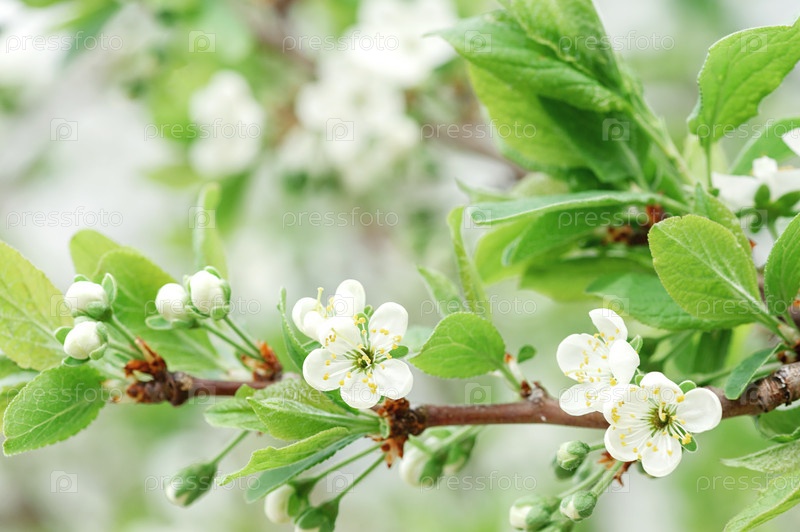 Цветы вишни на ветке. Белые соцветия фруктового дерева