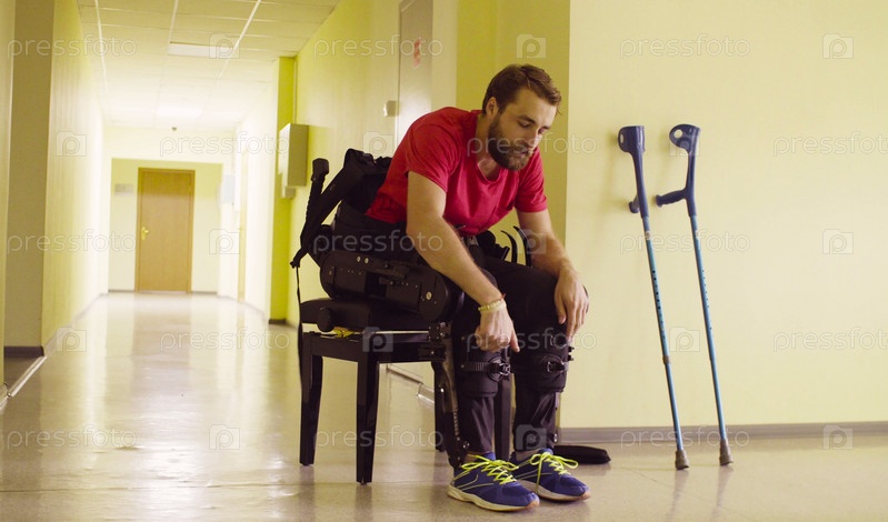 Человек-инвалид в роботизированном экзоскелете сидит на скамейке