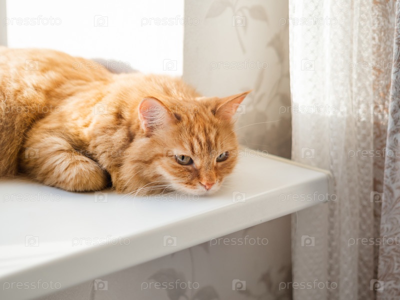 Милый рыжий кот лежит на подоконнике. Пушистый питомец дремлет на солнечном свете. Уютный дом. Комфорт и спокойствие