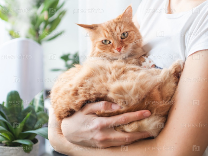 Женщина гладит милого рыжего кота. Ультразвуковой увлажнитель среди комнатных растений. Цветочные горшки с сочными растениями на подоконнике. Водяной пар увлажняет сухой воздух дома. Электрический прибор и пушистый питомец