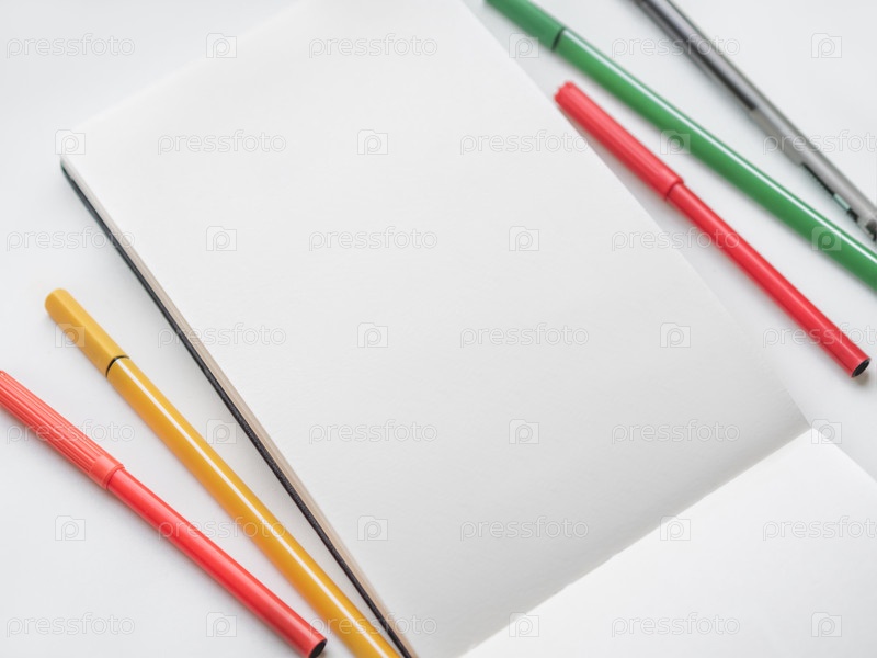 Вид сверху на чистую страницу блокнота. Макет фото с блокнотом и красочными маркерами на белом столе. Рабочее место художника
