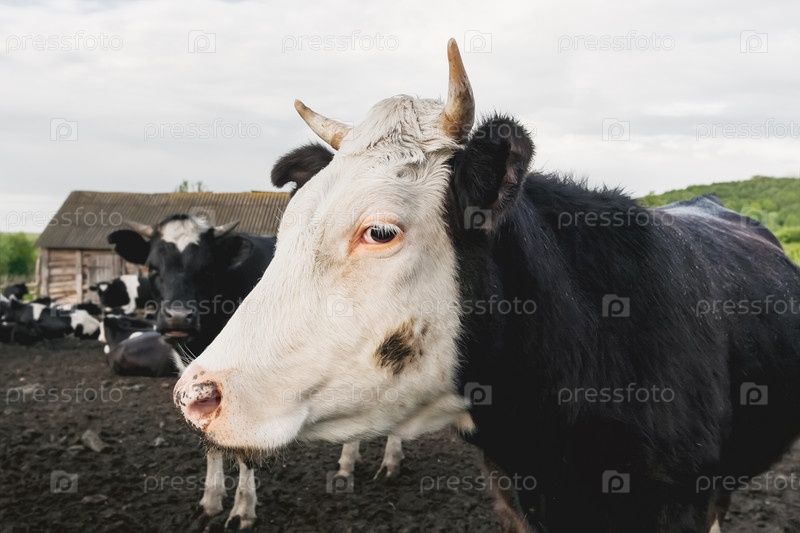 Крупным планом портрет любопытной коровы среди стада коров и быков. Молочные животные пасутся в загоне. Животноводство в сельской местности