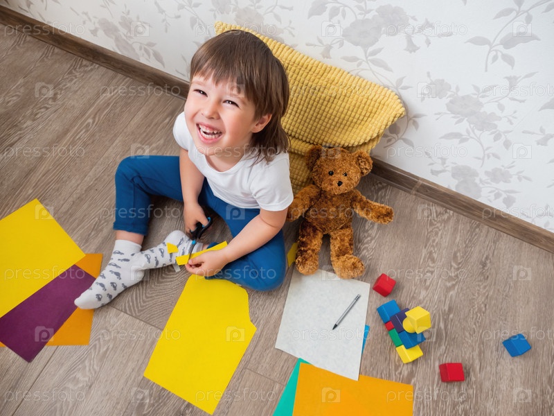 Малыш учится резать цветную бумагу ножницами. Малыш сидит на полу в детской комнате с игрушечными блоками и плюшевым мишкой. Образовательные занятия для детей. Развитие чувственных ощущений и мелкой моторики в домашних условиях