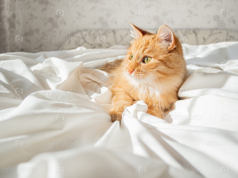 Милый рыжий кот лежит на белом белье в постели. Пушистый питомец дома. Любопытное домашнее животное в спальне