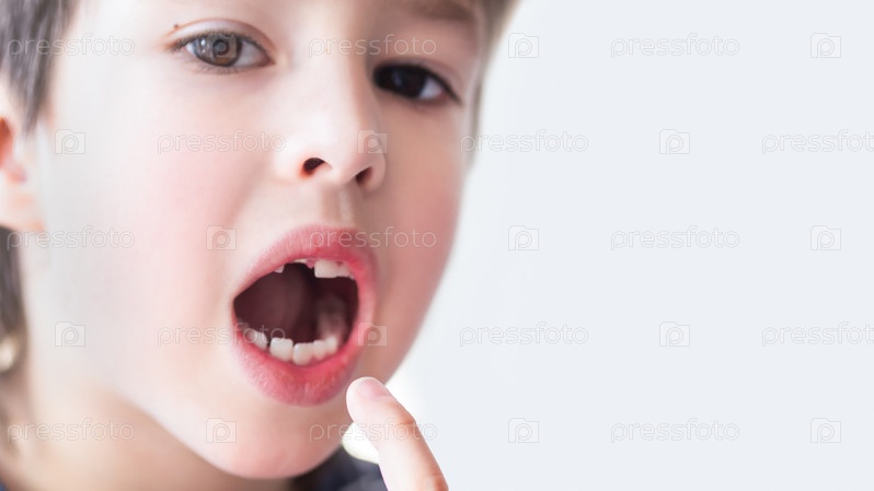 Улыбающийся малыш показывает дырку в ряду зубов во рту. Только что выпал один резец. Крупным планом фото десен для стоматолога. Копировать пространство