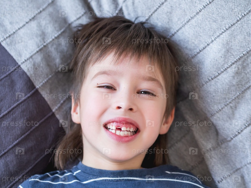 Смеющийся малыш показывает дырку в ряду зубов во рту. Только что выпал один резец. Крупным планом фото десен для стоматолога