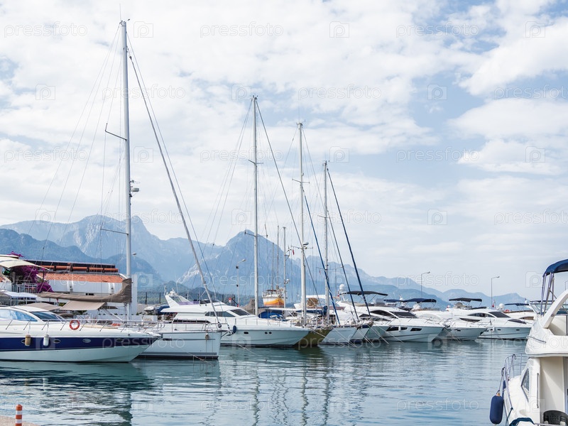 Яхты пришвартованы в Гранд Марине, Кемер, Турция. Красивые корабли для туристических поездок по Средиземному морю