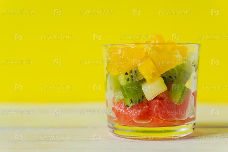 Диета Свежий вкусный фруктовый салат в стеклянной банке на ярко-желтом фоне. Нарезанные сочные апельсины, киви и грейпфруты