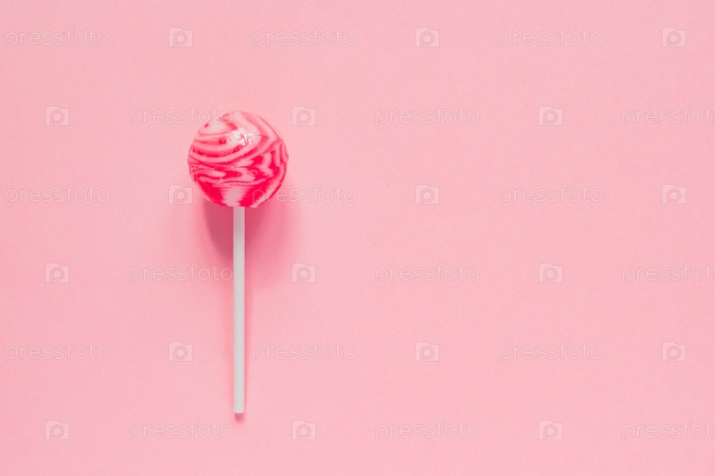 Сладкий вкусный розовый леденец на розовом фоне. Минимальная плоская планировка с копировальным пространством