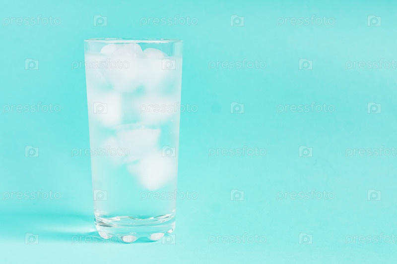 Крупный план чистой воды со льдом в высоком прозрачном стекле с копировальным пространством на синем фоне