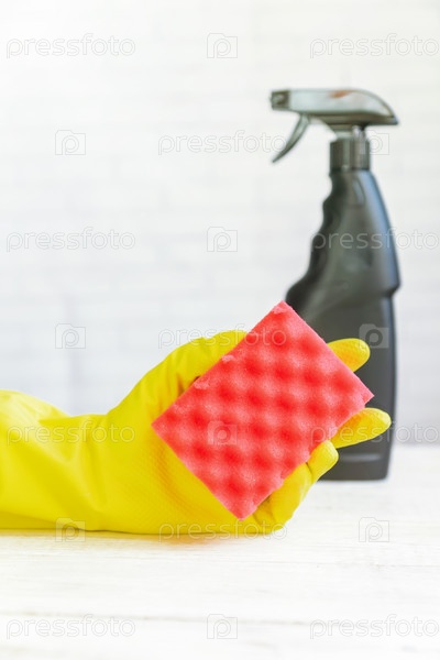 Рука женщины в желтой резиновой перчатке, держащей чистящую губку. . Чистящее средство