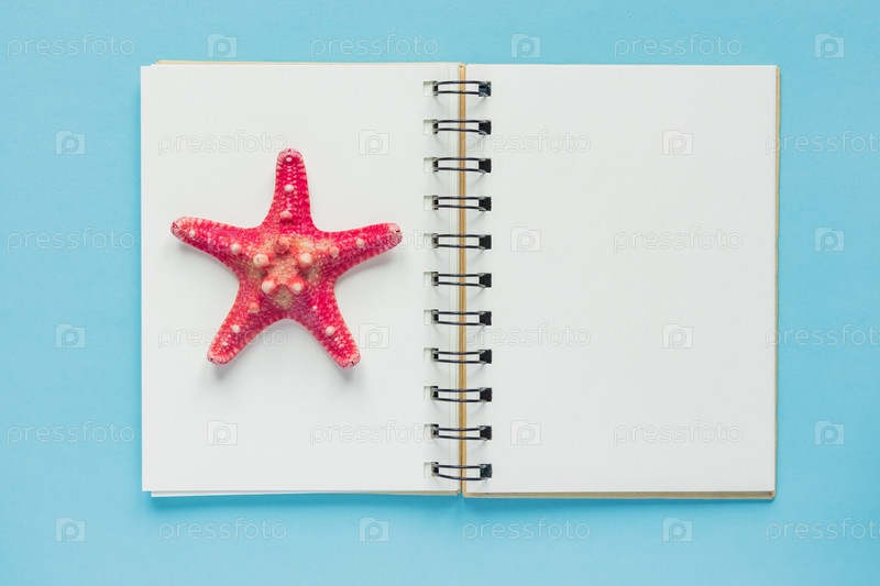 Вид сверху на открытую пустую тетрадь с морскими звездами на пастельно-синем красочном фоне. Концепция путешествий и отдыха