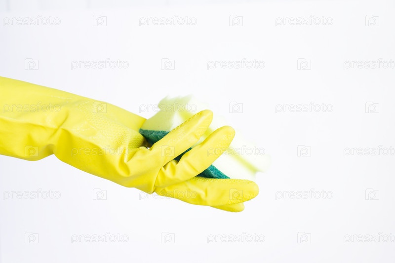 Рука с желтой перчаткой, держащая зеленую губку для чистки на белом фоне