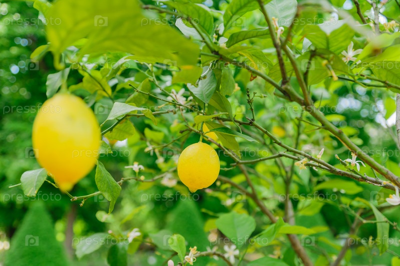 Яркие сочные лимоны висят на дереве. Выращивание цитрусовых