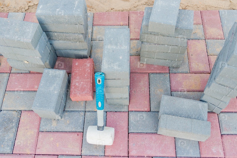 Красные и серые бетонные брусчатки. Мощение дорог, строительство