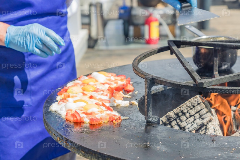 Шеф-повар готовит яичницу с помидорами на фестивале. Уличная еда, приготовленная на гриле