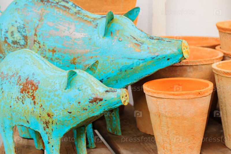 Две забавные ржавые металлические синие свиньи на деревянном столе. украшение интерьера или сада