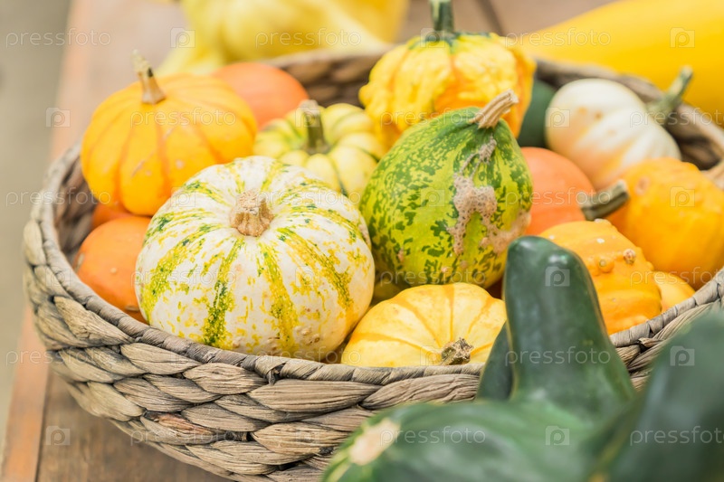 Ассортимент маленьких декоративных тыкв разных цветов и форм в корзине. Осенняя интерьерная композиция