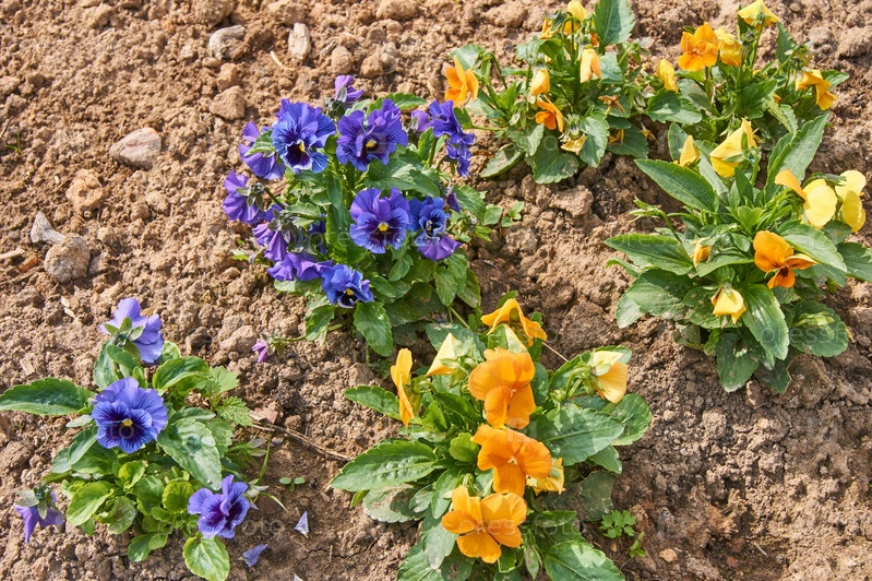 Клумба из синих и оранжевых трусиков в саду