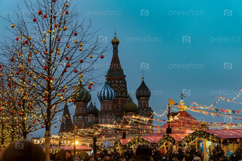 МОСКВА, РОССИЯ - 18 декабря 2019 года: Рождественские украшения и ярмарка на Красной площади в Москве