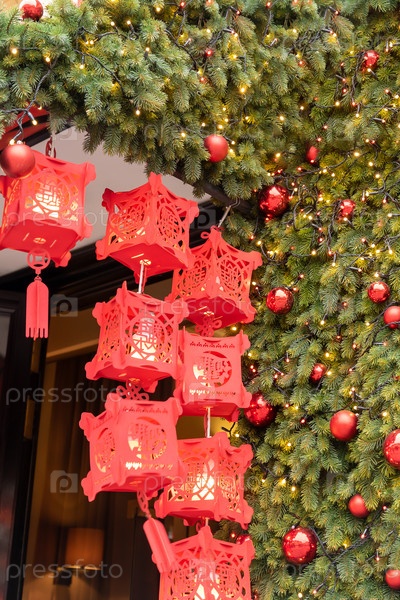 Китайские новогодние фонарики в чайна-тауне. Оформление входа в дом еловыми ветками и шарами