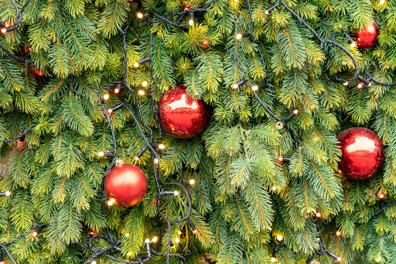 Закройте украшение елки игрушками и гирляндами. Праздничная открытка к зимним праздникам
