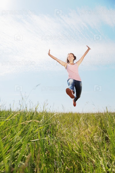 Весенняя девочка, девушка прыгает по зеленой траве