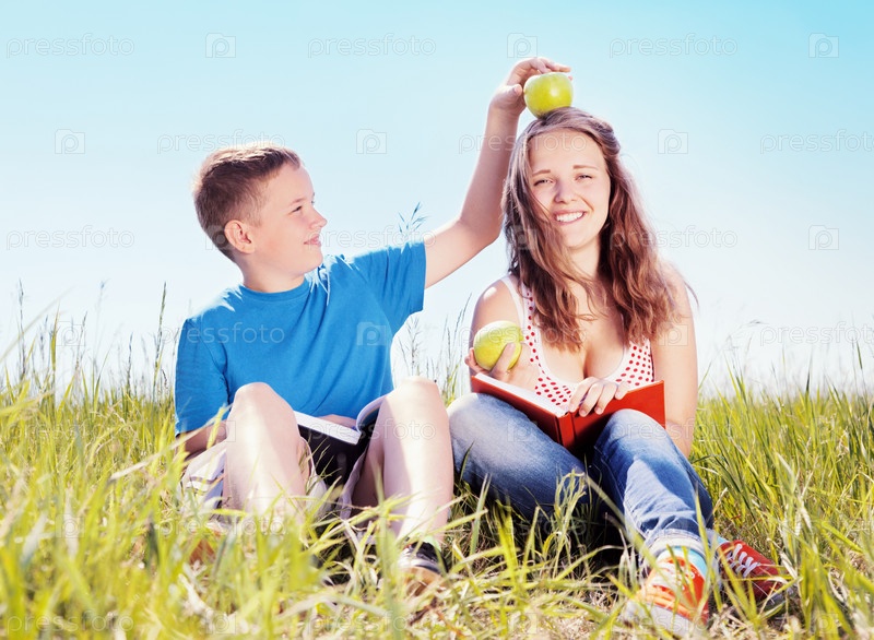 Летний портрет, дети с яблоками, подростки отдыхают на зеленой траве