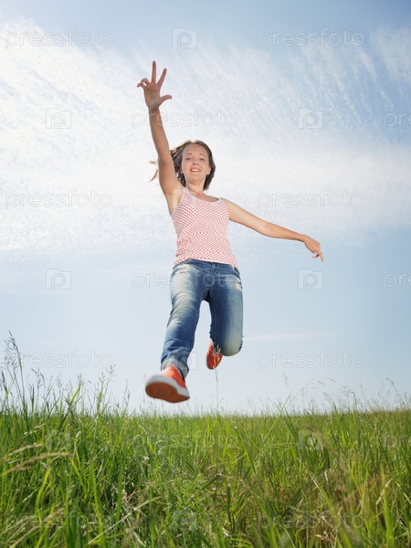 Весенняя девочка, девушка прыгает по зеленой траве