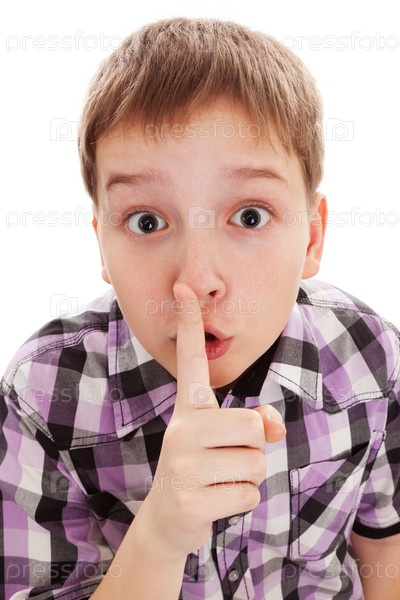 Секрет, мальчик-подросток нежно показывает пальцем на белом фоне