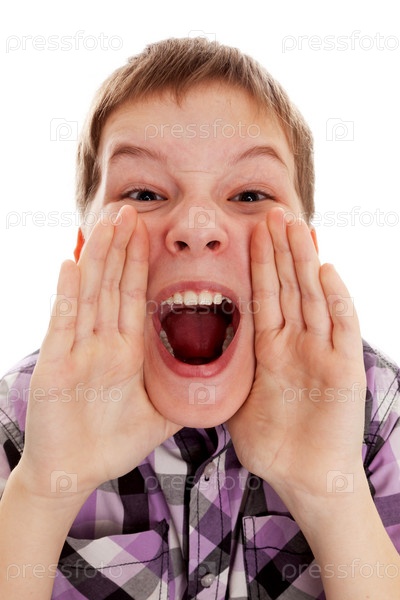 Крупным планом портрет мальчика, кричащего вслух на белом фоне