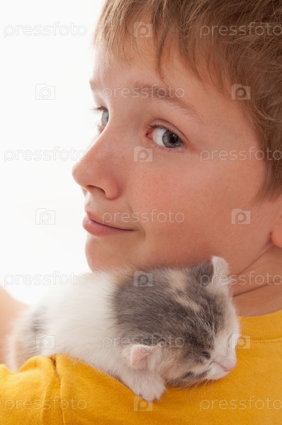 Мальчик и котенок, Котенок спит на плече мальчика, крупный план