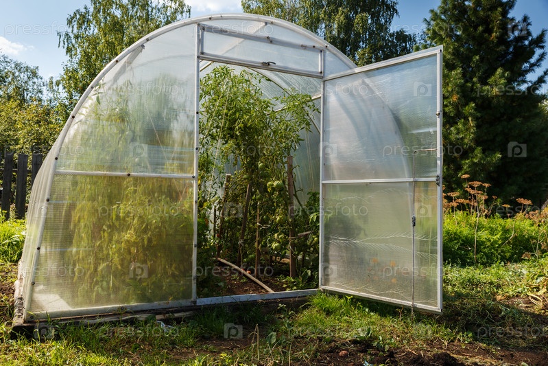 Теплица из поликарбоната в саду. теплицы из поликарбоната в саду. Открытая дверь в оранжерею