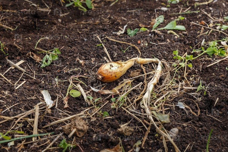 Один лук, лежащий на почве в саду. Урожай лука