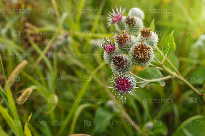 Arctium lappa обычно называют большим лопухом.Цветущие цветы лопуха на естественном фоне растений