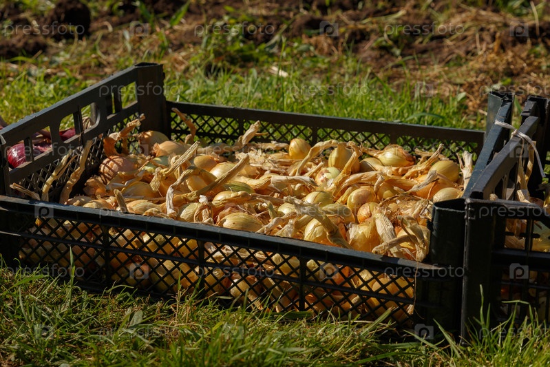 Лук в черной пластиковой коробке на траве. Уборка лука