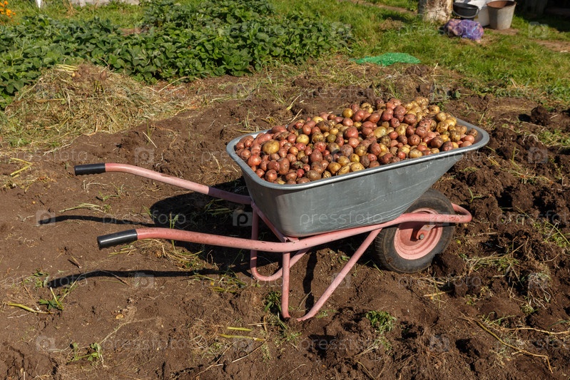 Свежий органический картофель в садовой тачке. Уборка картофеля осенью