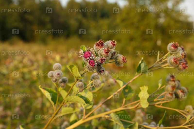 Arctium lappa обычно называют большим лопухом.Цветущие цветы лопуха на естественном фоне растений