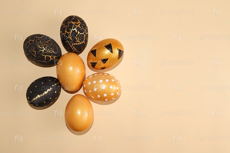 Концепция счастливой Пасхи, весенняя открытка, фон. Украшенные золотые пасхальные яйца на сером фоне. Минимальная праздничная концепция, место для текста, баннер для экрана, шаблон для дизайна, выборочный фокус