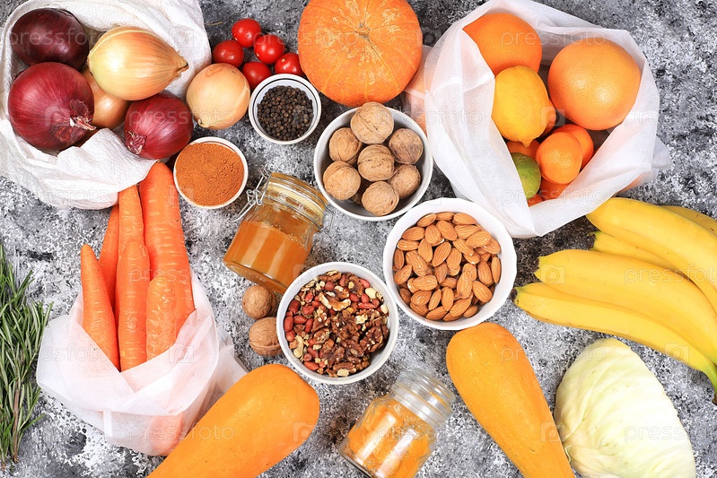 Здоровая натуральная диетическая пища в эко-мешках и банках. Выбор свежих фруктов и овощей с витамином С для укрепления иммунной системы и похудения, концепция нулевых отходов, доставка еды, выборочная направленность